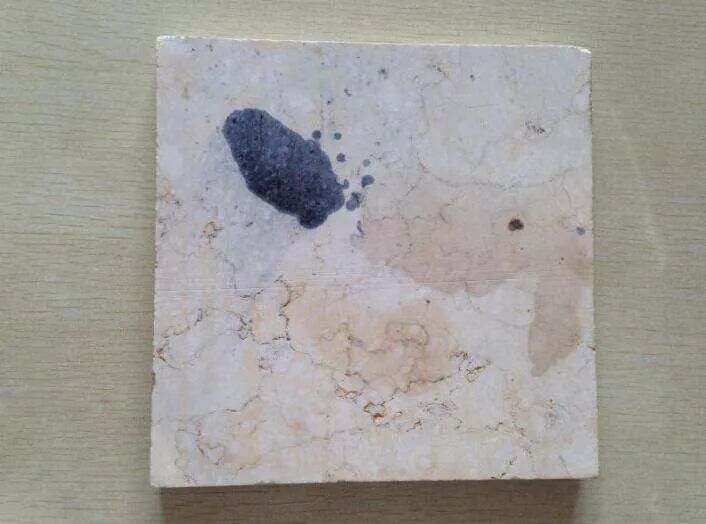 墨水污染分为水溶性墨水和油溶性墨水污染。其颜色众多,污染时的附着性、渗透性较强,而且时间越长越难清除。墨水污染还会随时间的延长、颜色变深、扩散、渗入,使清除更难。所以,在条件允许的情况下,应对刚污染的石材立刻清洗,即使手边没有专用清洗剂,也要用日用化学清洗剂清洗一下,或用软纸、布类等将尚未干燥的墨水吸走。